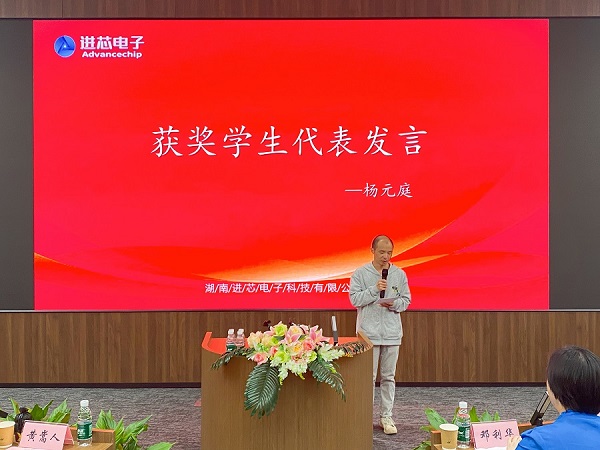 “進芯電子獎學金”獲獎學生代表發(fā)言,他感謝進芯電子對青年學子的支持,感謝學校對自身的培養(yǎng),表示深耕專業(yè)知識、厚植家國情懷是成才的必經(jīng)之路,他將再接再厲,勇創(chuàng)佳績。