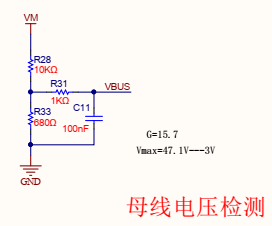 ADC采樣母線采樣電路,母線電壓的值進(jìn)行分壓送到芯片AD口,參與到FOC的運(yùn)算。