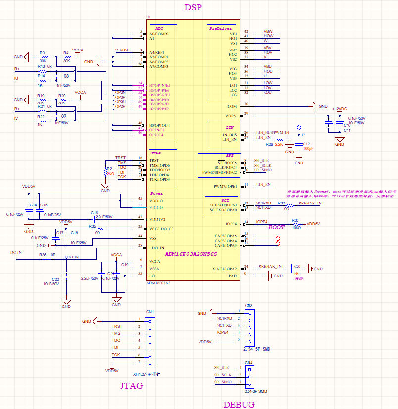 ADM16F03A2最小系統(tǒng)如下圖所示,包含JTAG接口、SPI通信接口、串口、PWM模塊、ADC模塊等。系統(tǒng)自帶的運(yùn)放PGA可以通過(guò)外圍電阻配置為差分模式用于相線電流采樣。當(dāng)需要用到SPI調(diào)試時(shí),可以通過(guò)SPI接口,借助進(jìn)芯SPI通訊調(diào)試工具進(jìn)行SPI通信調(diào)試;當(dāng)需要離線燒錄程序時(shí),通過(guò)3V3、TX、RX、GND信號(hào)測(cè)試焊盤,借助進(jìn)芯的離線燒錄工具可實(shí)現(xiàn)快速的脫機(jī)燒錄。