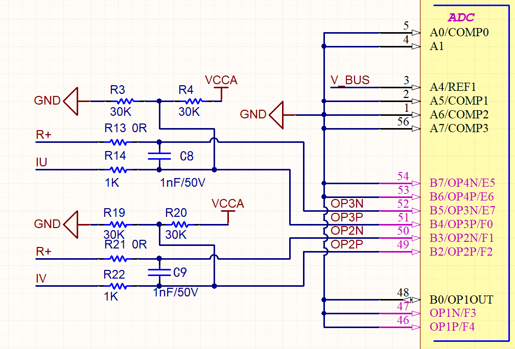 ADC采樣電路包括兩路橋臂相電流的采樣和母線電壓采樣。相線電流用于堵轉(zhuǎn)位置檢測(cè) 后續(xù)還可用于電流環(huán) 母線電壓檢測(cè)除用于保護(hù)外 還為軟件算法的計(jì)算提供電壓參數(shù)