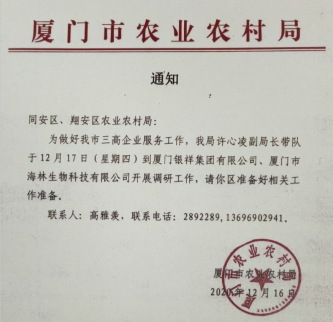 廈門市農(nóng)業(yè)農(nóng)村局蒞臨廈門市海林生物科技有限公司開展三高企業(yè)服務(wù)調(diào)研工作