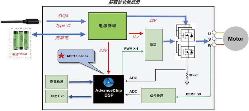 筋膜槍解決方案基于進(jìn)芯ADP16F03系列高性價(jià)比16位DSP芯片,實(shí)現(xiàn)手持筋膜槍的多種智能控制。