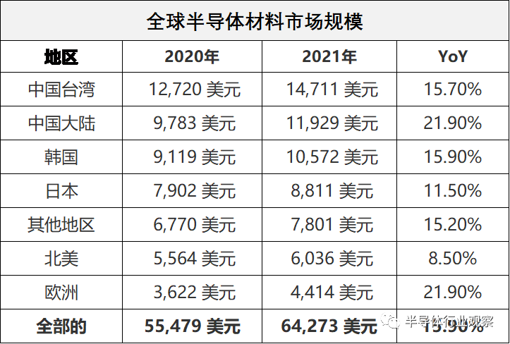 其中,中國(guó)大陸2021年半導(dǎo)體材料的市場(chǎng)約為119.3億美元,同比增21.9%。