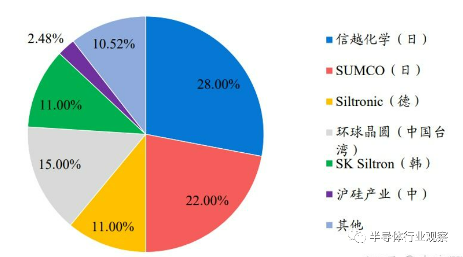 在硅片市場(chǎng)中,日本信越化學(xué)占比28%,SUMCO占比22%,中國(guó)臺(tái)灣的環(huán)球晶圓占比15%,德國(guó)Siltronic占比11%,韓國(guó)SK Siltron占比11%。前五大廠商共占據(jù)87%的市場(chǎng)份額,細(xì)分市場(chǎng)集中度較高。